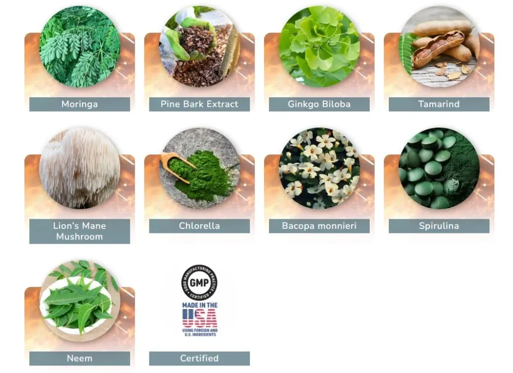 | Key Ingredients | Bacopa Monnieri, Ginkgo Biloba, Lion’s Mane, Pine Bark Extract, Spirulina, Chlorella |