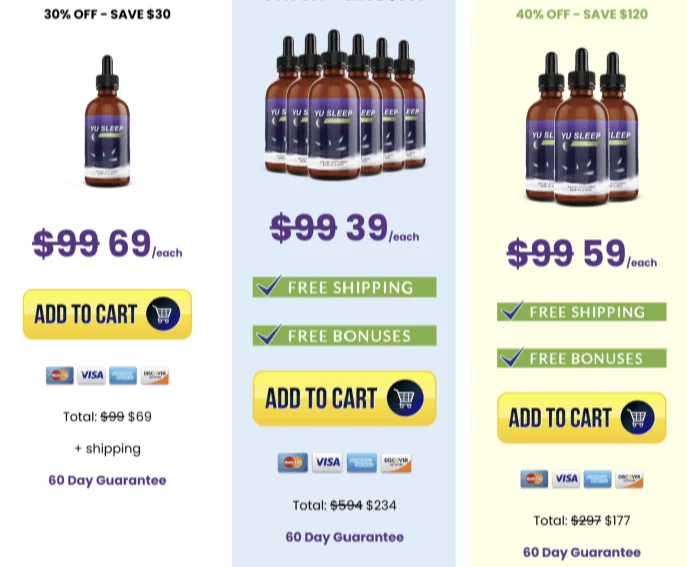 Here’s the general pricing structure for Yu Sleep.Each bottle typically comes with a 60-day money-back guarantee, making it low-risk to try.